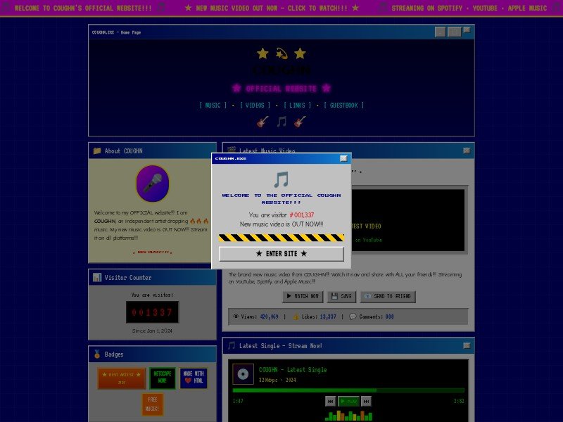 A nostalgic Windows 98–style music artist website template featuring video promo, streaming links, guestbook, and badges for indie musicians and creators.