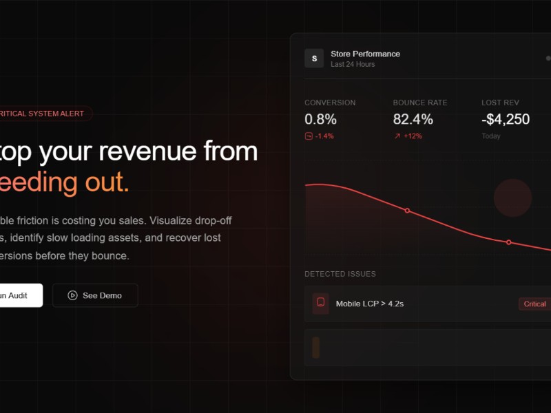 Use this template to quickly prototype or ship a compelling hero section that visualizes loss and urgency for analytics, performance, and ecommerce optimization platforms.