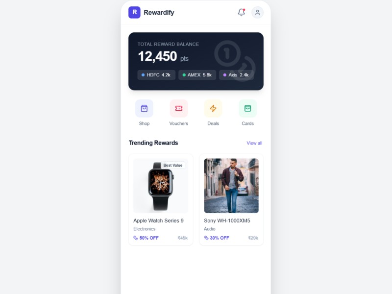 Rewardify Rewards Marketplace App UI Template delivers a polished mobile experience for loyalty and fintech products.
