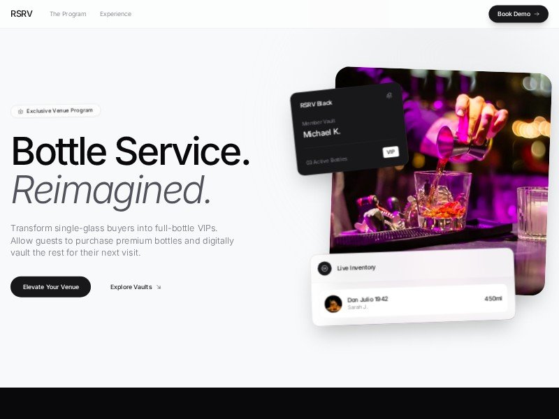 RSRV is a sophisticated landing page template built for the next generation of hospitality technology. It focuses on transforming casual guests into loyal VIPs through a unique digital bottle storage (vault) concept.