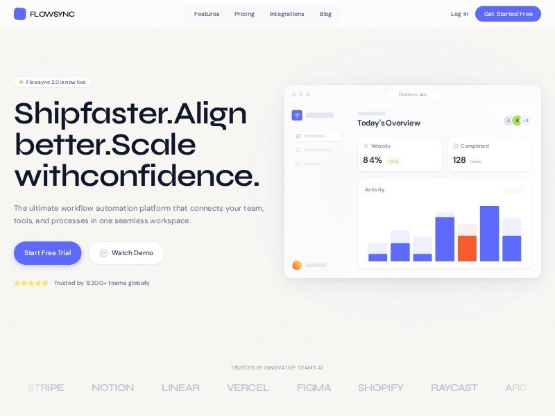 A reusable SaaS landing page template for workflow automation platforms, built to showcase features, integrations, pricing, testimonials, and free-trial CTAs.