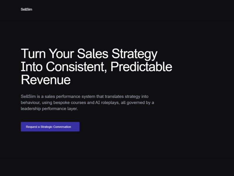 A dark, minimal landing page template for sales execution platforms to showcase strategic sales systems, AI roleplays, and performance management.