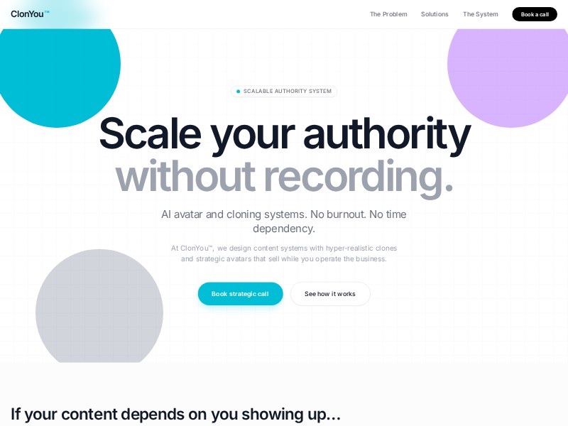 A premium AI cloning and avatar service landing page template for agencies and founders to showcase scalable authority systems and book strategic sales calls.
