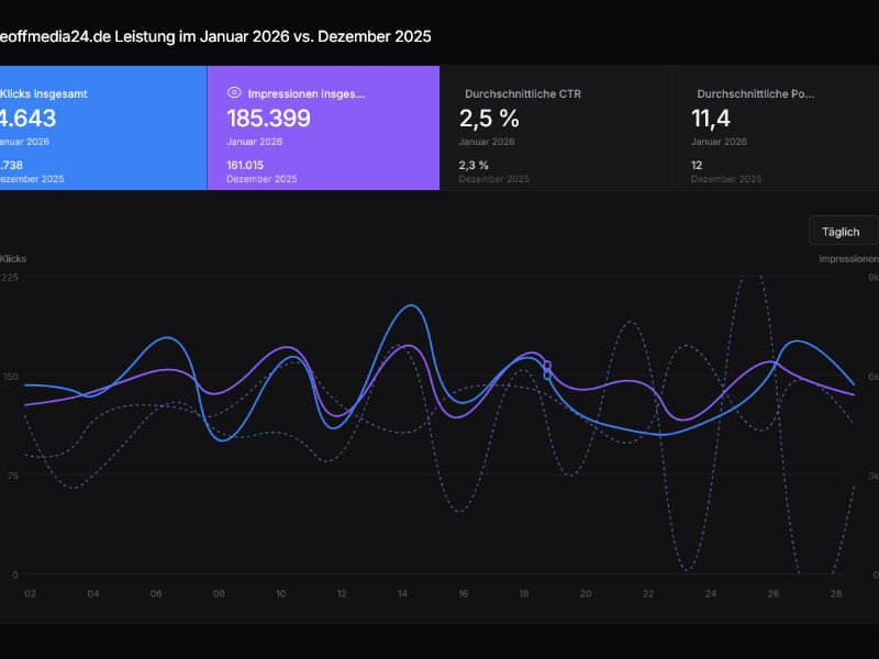 A sleek, dark-mode analytics template for showcasing Search Console performance with modern cards and comparison charts.