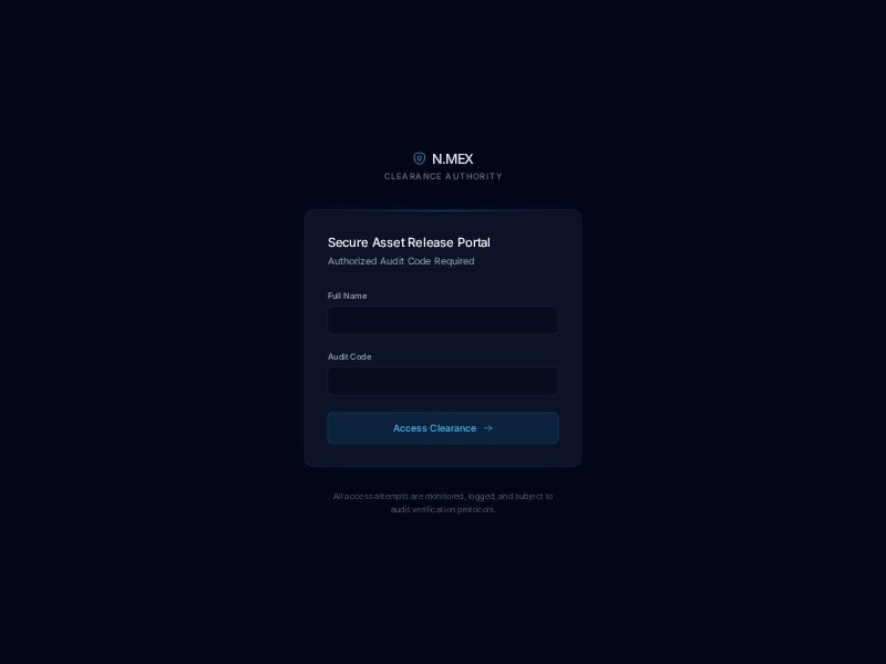 N.MEX Secure Clearance Portal Template delivers a polished, dark-mode interface for controlled asset release and internal verification.