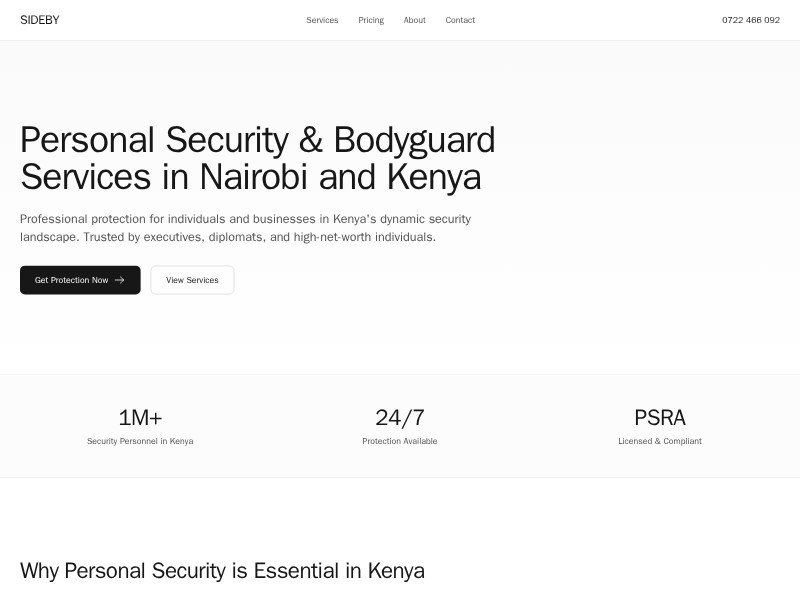 A modern, conversion-focused template for security and bodyguard companies in Kenya, built with clear sections for services, pricing, and lead capture.