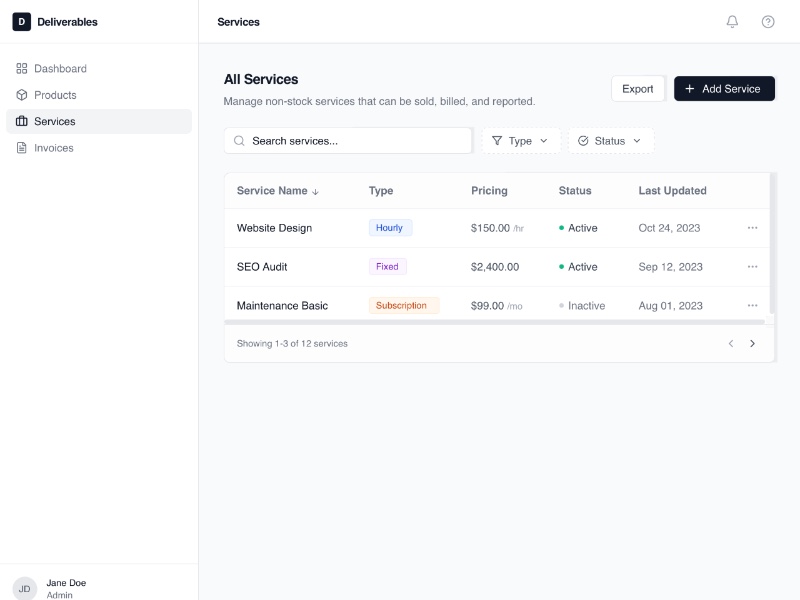 Deliverables is a modern services management dashboard UI template built with Tailwind CSS, designed to help teams organize and price billable services.
