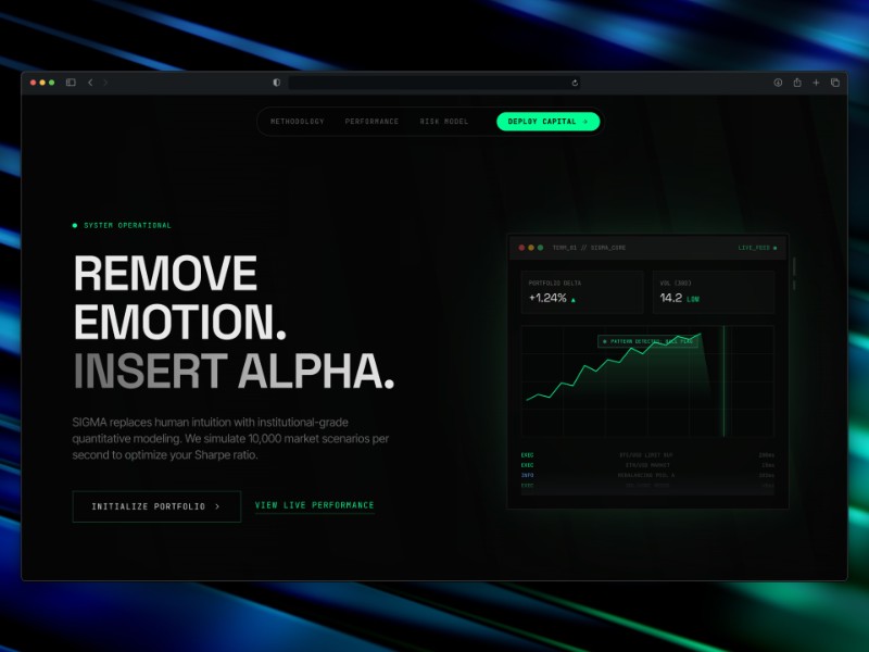 SIGMA Quant Finance Landing Page Template delivers a high-impact, institutional-grade aesthetic for quant and algorithmic trading platforms.
