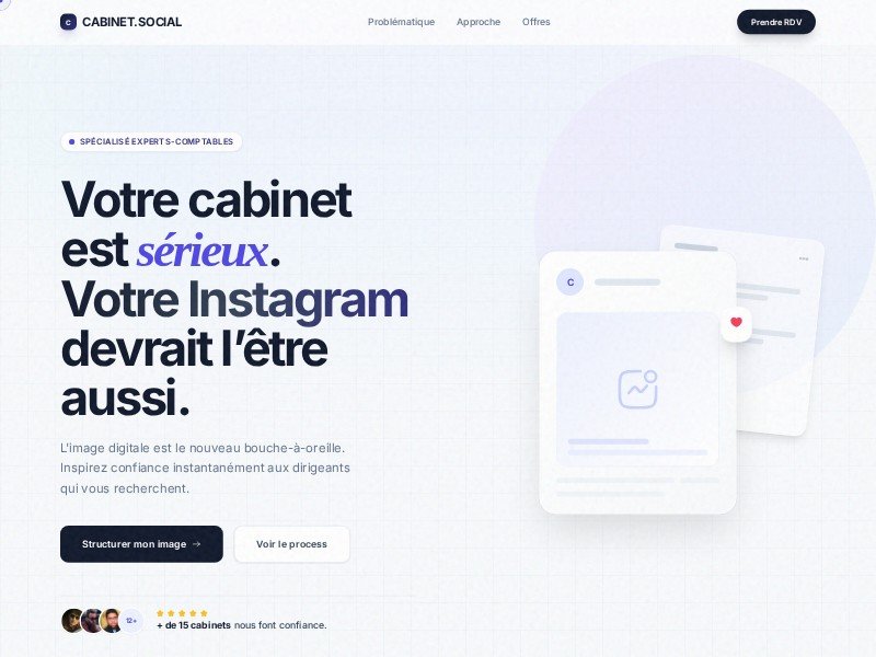 Cabinet.Social est une landing page moderne dédiée aux agences et freelances qui gèrent l’image sociale de cabinets d’experts-comptables.