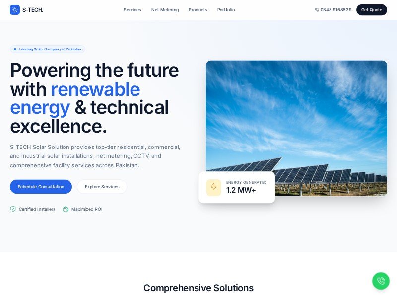 A reusable landing page template for solar, net metering, and technical services companies to showcase offerings, equipment, portfolio, and lead-generation contact forms.