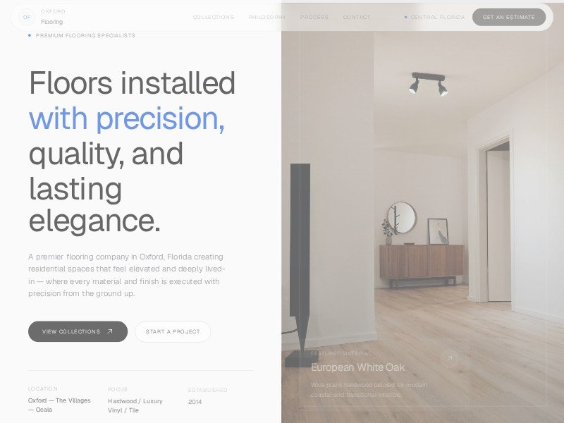 A sophisticated, high-end construction and interior services template designed for premium flooring specialists and residential contractors.