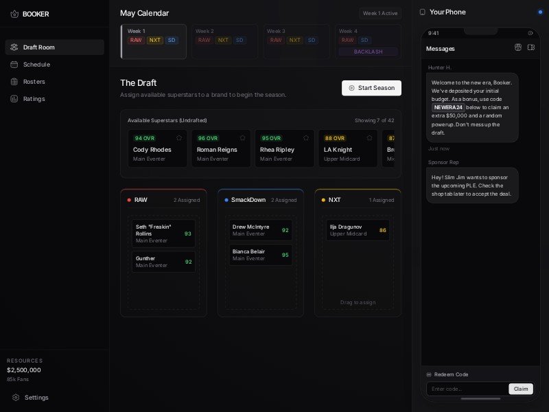 A polished dark-mode template designed for sports, fantasy, or entertainment management products. It combines season planning, roster drafting, and mobile-style communication into one immersive interface.