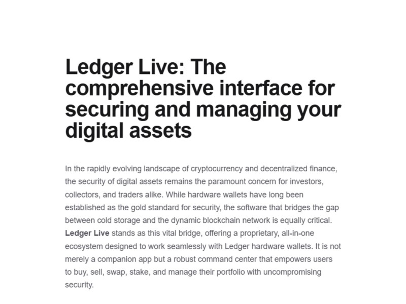 Ledger Live is the official companion application for Ledger hardware wallets, designed to help users securely manage, grow, and monitor their digital assets from a single, intuitive platform.