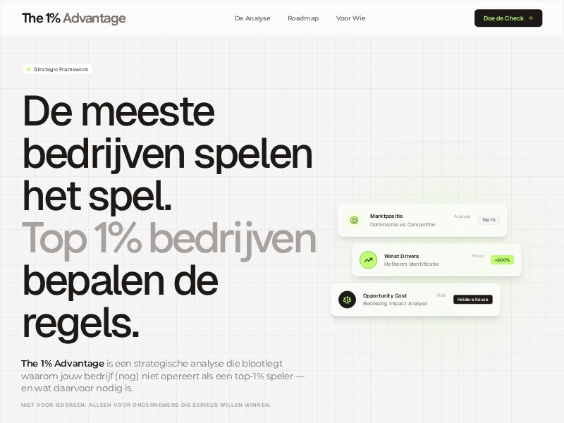 A high-converting, Dutch-language landing page template for premium strategic consulting offers like “The 1% Advantage,” optimized for ambitious business owners.