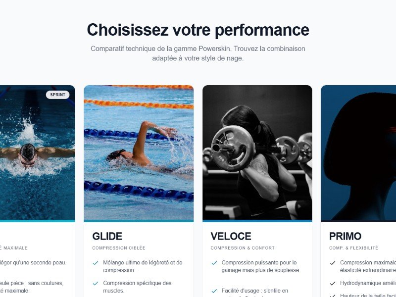 A clean comparison landing page template for showcasing and contrasting high-performance swimwear or sports gear models to help athletes choose the right product.
