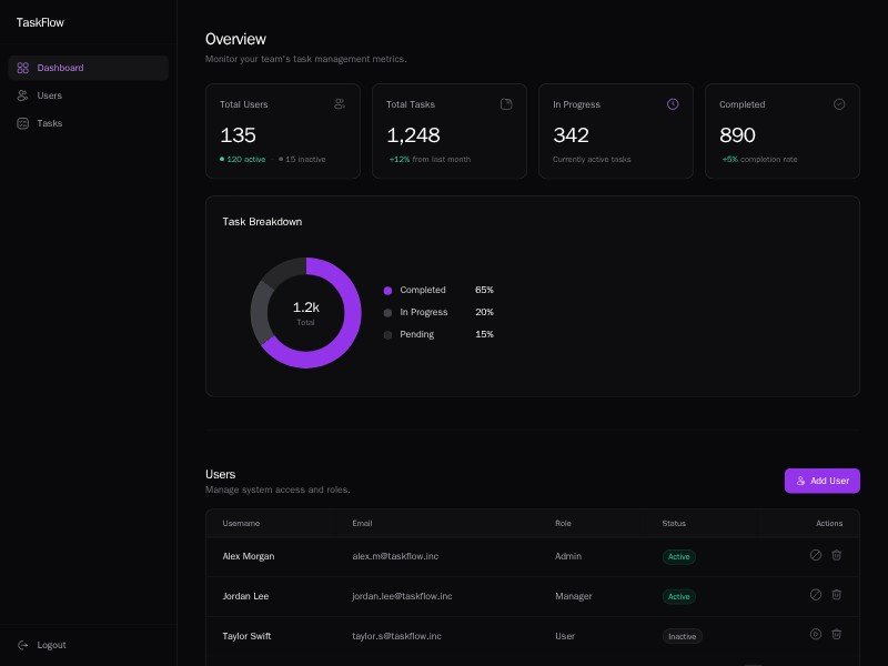 TaskFlow is a sleek, brand-forward admin dashboard template built for modern productivity applications. It features a high-contrast dark interface that prioritizes data readability and user efficiency.