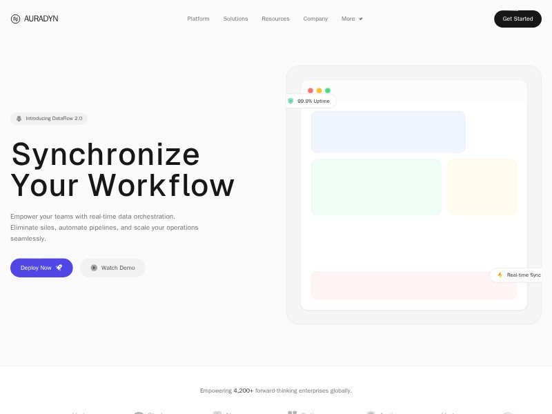 A polished landing page template for data platforms, cloud infrastructure tools, and workflow automation products. It combines a premium enterprise feel with animated UI sections, feature storytelling, and strong conversion points.