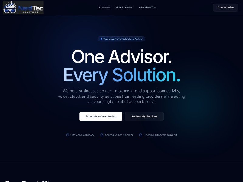 A reusable landing page template for technology advisory and telecom services brands to showcase capabilities, process, and consultation-focused CTAs.
