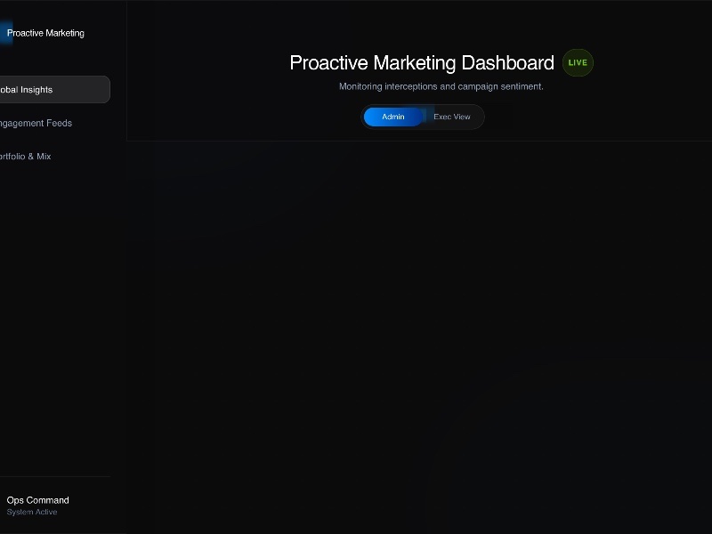A reusable dark-mode template for building executive marketing dashboards that track campaign performance, sentiment, social feeds, and portfolio insights.