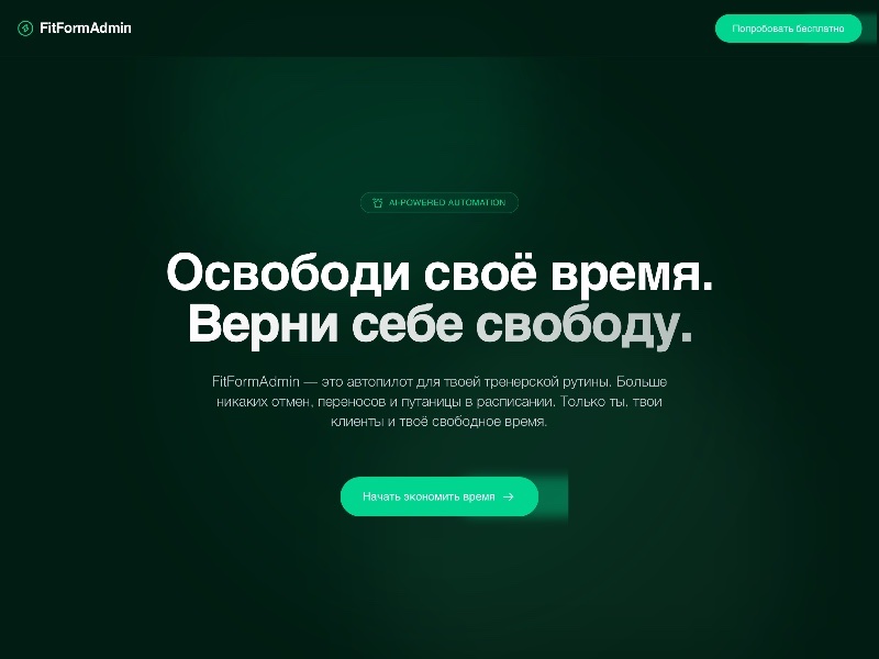 FitFormAdmin — тёмный неоновый SaaS лендинг-шаблон для фитнес‑тренеров, подчеркивающий автоматизацию рутины и AI‑ассистента.