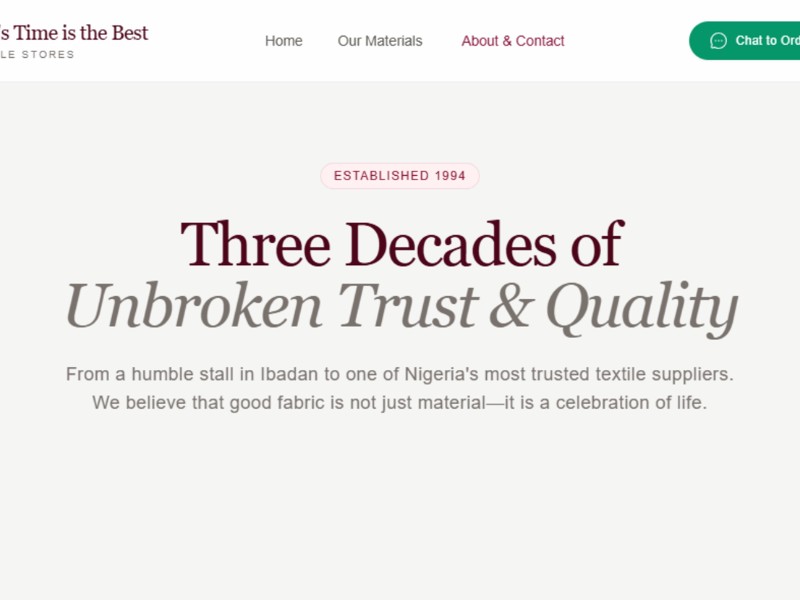 Perfect for textile shops, fabric wholesalers, and local fashion retailers who want a ready-made about/contact layout that builds credibility and drives inquiries via form, phone, and WhatsApp.
