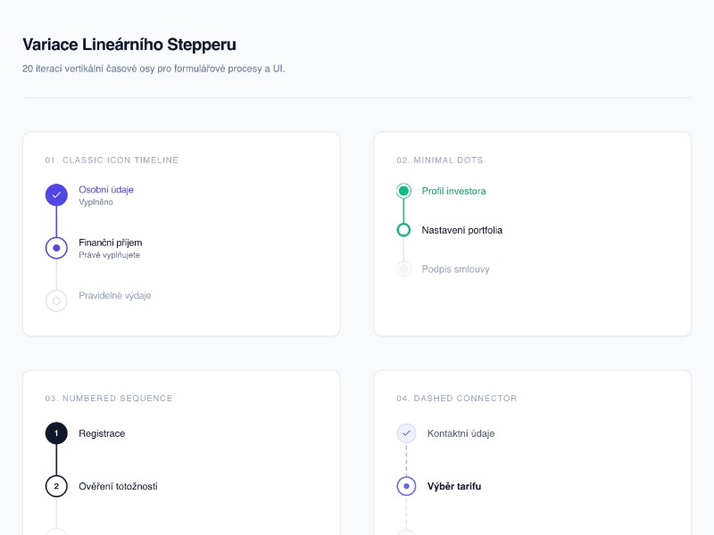- 20 unique timeline stepper variations (classic, minimal, numbered, gradient, dark mode, pill, micro, and more)