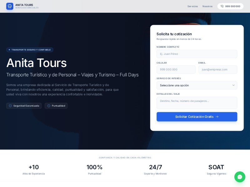 Anita Tours Landing Page Template es una página lista para usar para negocios de transporte turístico, corporativo y full days.