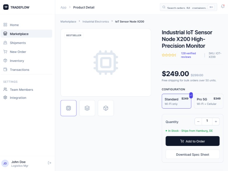 - Order creation flow tailored to B2B logistics (Incoterms, ports, suppliers)