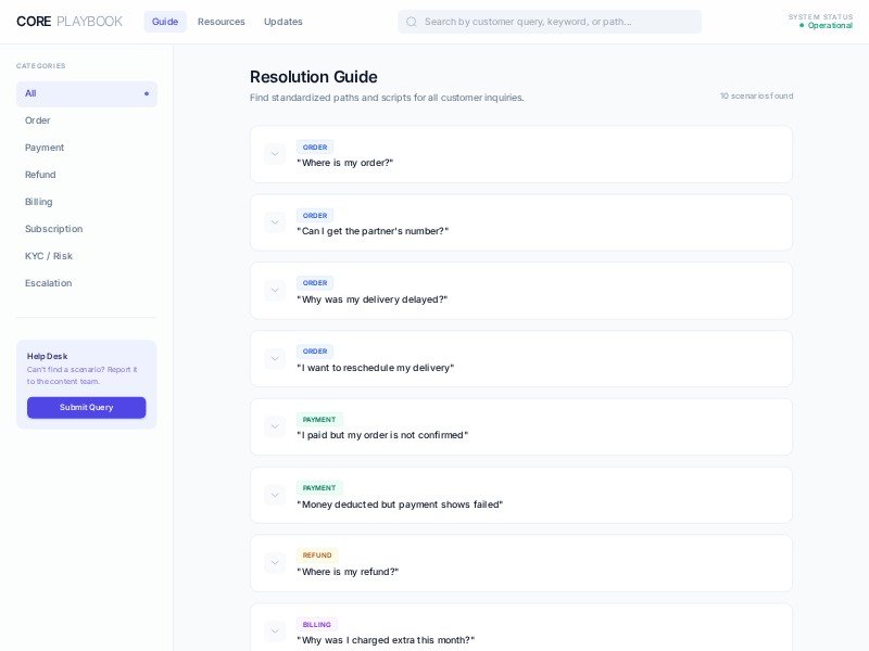 This Documentation Template provides a high-performance interface for customer support teams to access standardized resolution paths, interaction scripts, and escalation protocols. It features a robust search and category filtering system to reduce agent handling time.