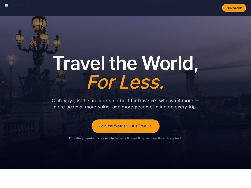 A polished landing page template built for travel clubs, subscription brands, and membership-based travel services that want to drive waitlist signups and showcase tiered plans.