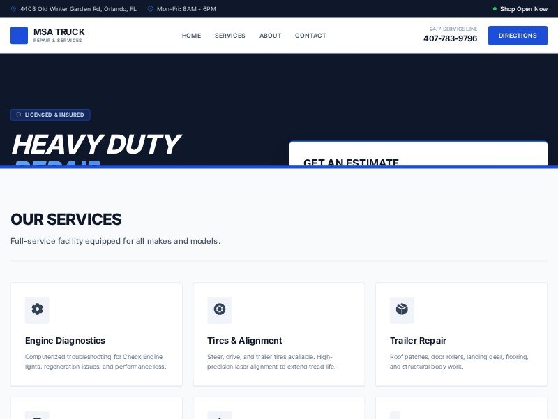 A clean, mobile-ready template for truck and trailer repair shops to highlight services, location, and 24/7 support.