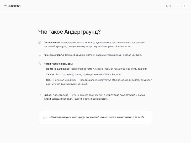 A reusable presentation template for exploring underground culture, community, third places, and attention through clean, discussion-led educational slides.