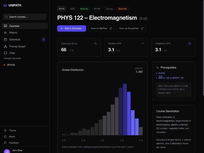 A dark, data-rich course detail interface for university portals and edtech products. Perfect for showcasing a single course with actionable planning tools.