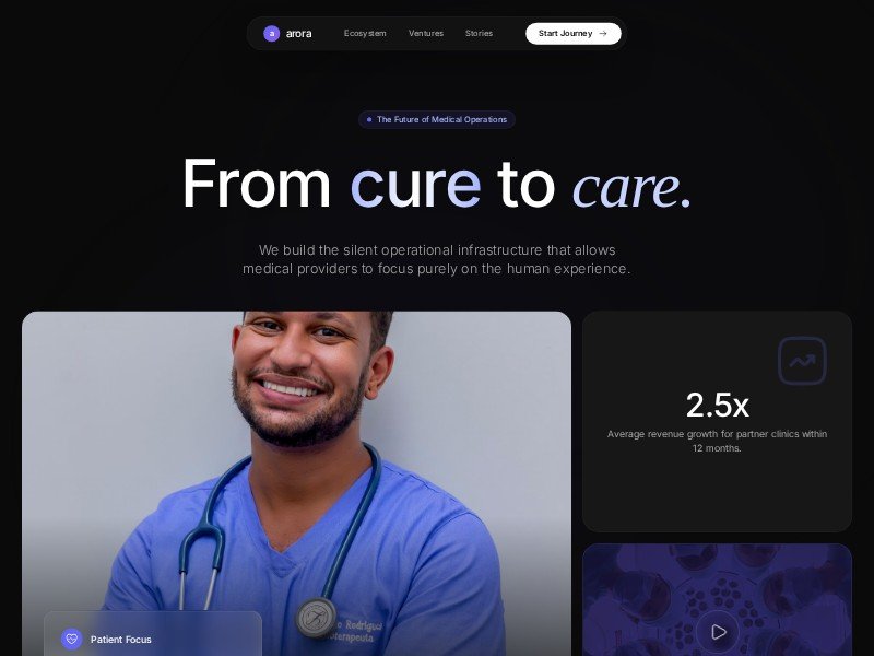 Arora Healthcare Operations Landing Page Template is a dark, gradient-rich one-page design for modern medical and telehealth platforms.