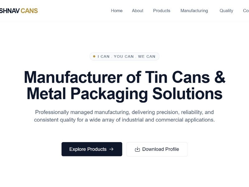 A professional manufacturing landing page template designed for tin can and metal packaging companies to showcase products, quality standards, and industrial capabilities.