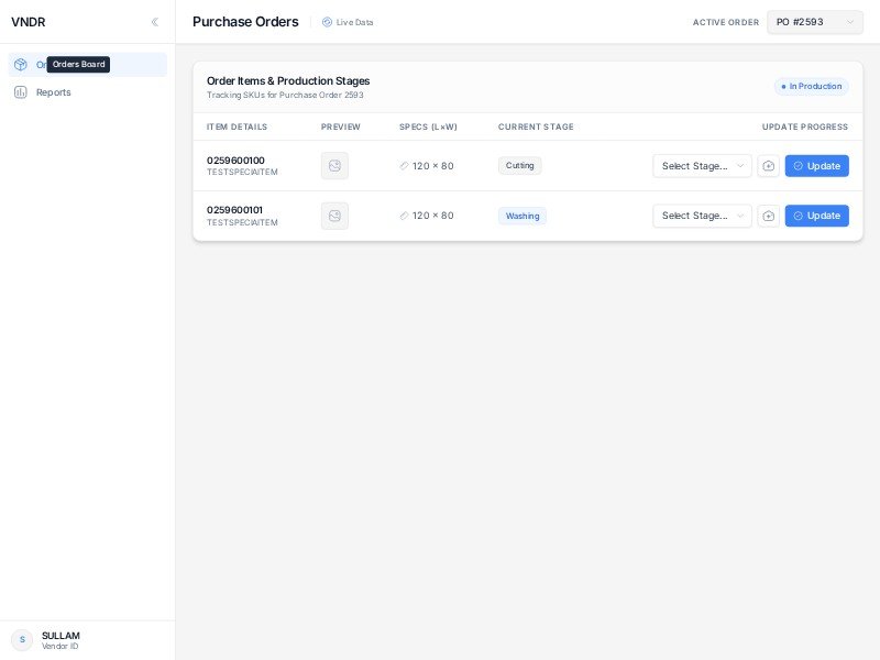 A reusable vendor operations dashboard template for tracking purchase orders, production stages, and item progress in a clean admin interface.