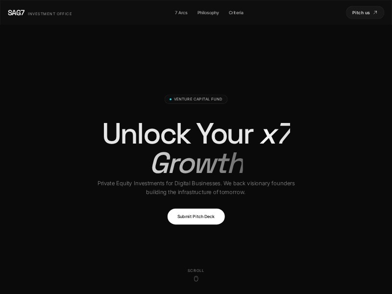 A polished, high-end template for investment offices, VC funds, and private equity firms focused on digital businesses and founder outreach.