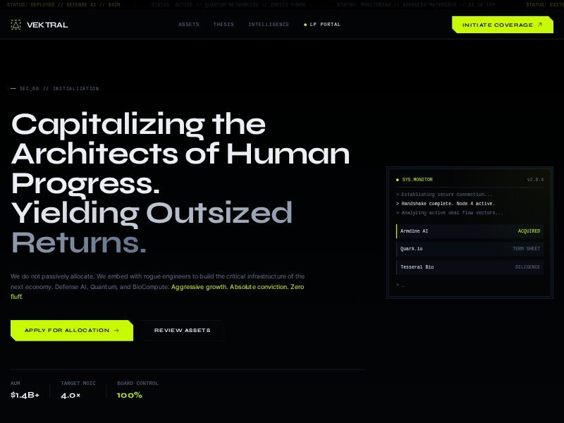 A cinematic, dark-mode landing page template for venture capital firms, deep tech funds, and institutional investment brands that want a premium, high-authority web presence.