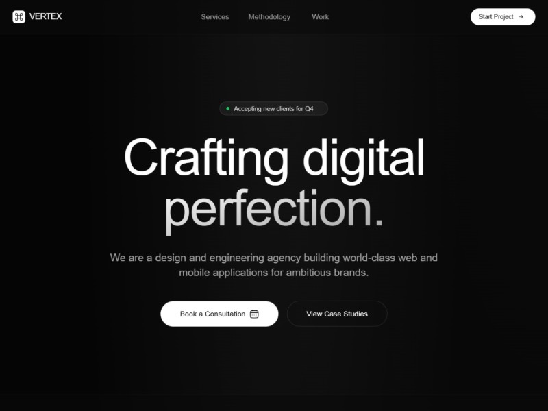 Vertex is a dark, high-impact digital product agency landing page template built with Tailwind CSS.