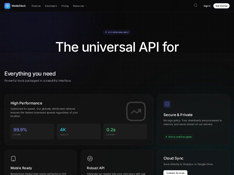 Perfect for launching or validating a media API or download service, this template helps you quickly present value, convert visitors, and onboard developers with clear CTAs and documentation paths.