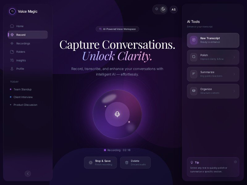 Voice Magic is a sophisticated, dark-mode dashboard template tailored for the next generation of AI audio applications. It features a stunning glassmorphism design with interactive cosmic elements and a central immersive recording interface.