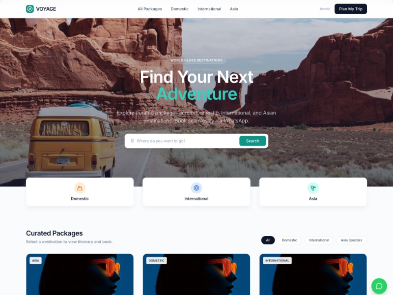 A modern Voyage travel booking landing page template for showcasing curated tour packages and capturing WhatsApp enquiries for domestic and international trips.