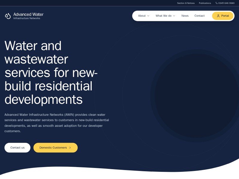 A professional landing page template for water and wastewater infrastructure companies focused on new-build residential developments. It combines a strong corporate visual style with clear service positioning and conversion-focused sections.