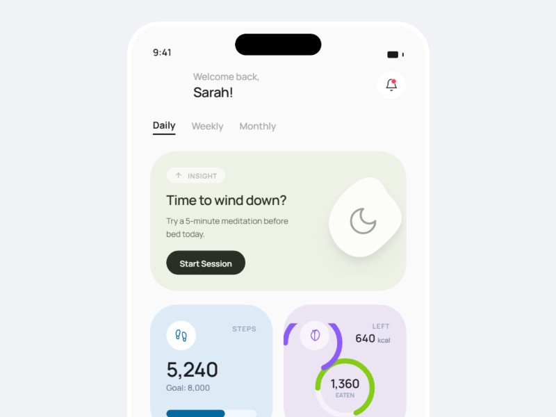 A mobile wellness app dashboard UI template for tracking sleep, steps, calories, and habits, ready to customize for modern health and fitness products.