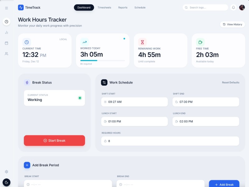 A modern Work Hours Tracker dashboard UI template for time tracking apps, helping you monitor shifts, breaks, and required hours with a clean layout.