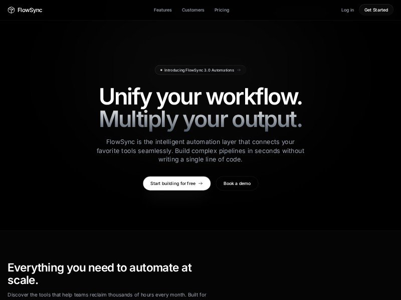A polished dark-mode landing page template designed for automation platforms, no-code tools, and AI-powered SaaS products.