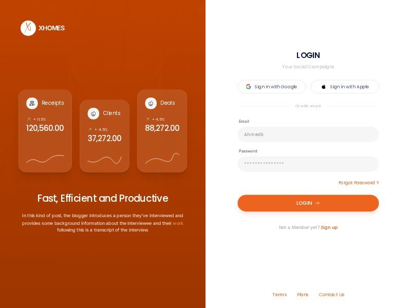A modern XHOMES login page template featuring social sign-in, email access, and a stat-driven hero panel for SaaS and campaign dashboards.