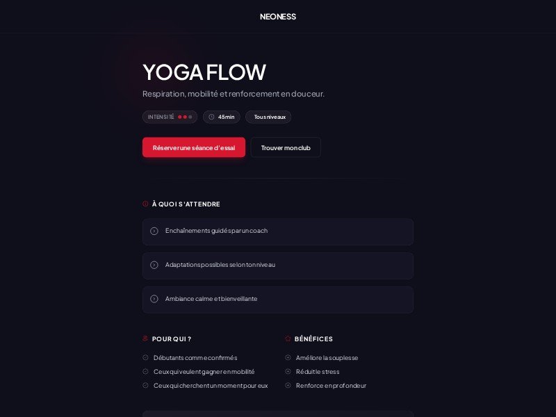 Neoness Yoga Flow is a focused landing page template designed to promote a single yoga or fitness class with a bold, dark aesthetic and clear CTAs.
