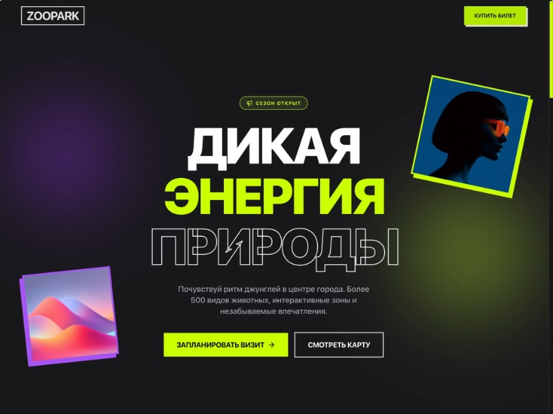 A bold, maximalist zoo landing page template for showcasing attractions, animals and online ticket sales for urban zoos or theme parks.